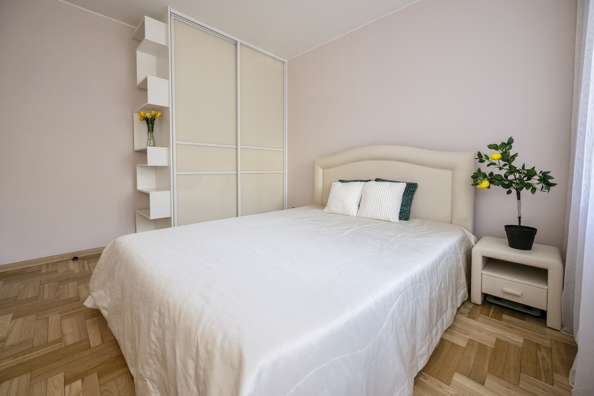 - Yra atskiras kambarys - drabužinė - šalia miegamojo kambario;
